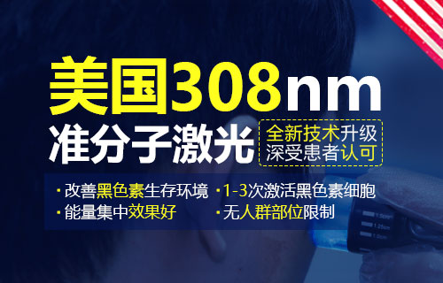 美国308准分子激光采用氯化氙绿色光源,可调光斑大小,无激素、刺激损伤、不伤皮肤,无任何毒副作用。能迅速改善黑色素生成环境,激活黑色素细胞。是早期白癜风患者的治疗选择较佳选择。